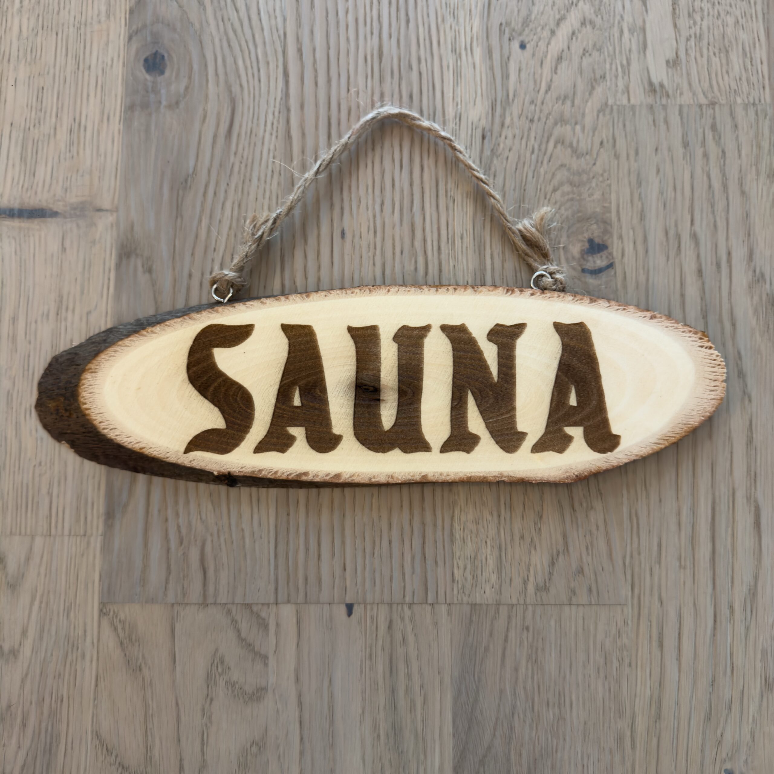 Saunakyltti koivusta joka on päällystetty puuöljyllä. Suositellaan ei niin kosteaan tilaan. Esimerkiksi vaatehuoneen oveen. Tilausta tehdessä voit toivoa omaa fonttia.